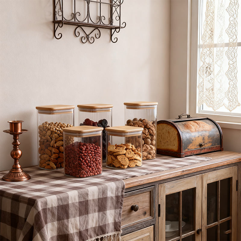 1150ML 유리 팬트리 보관 용기 사각형 나무 뚜껑 로고