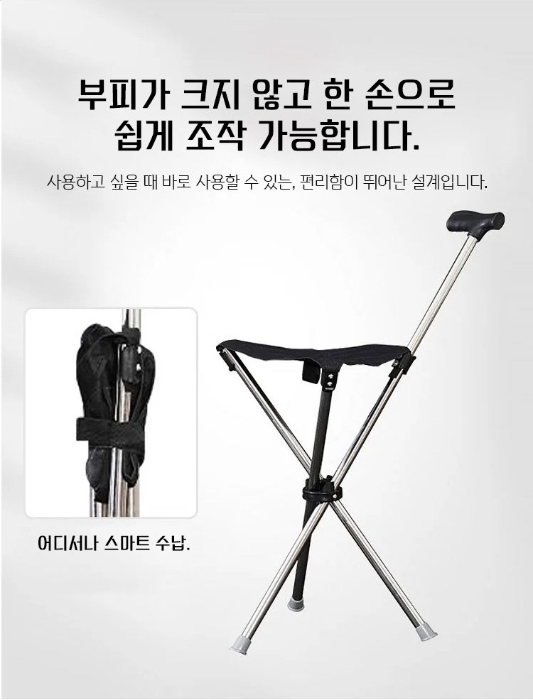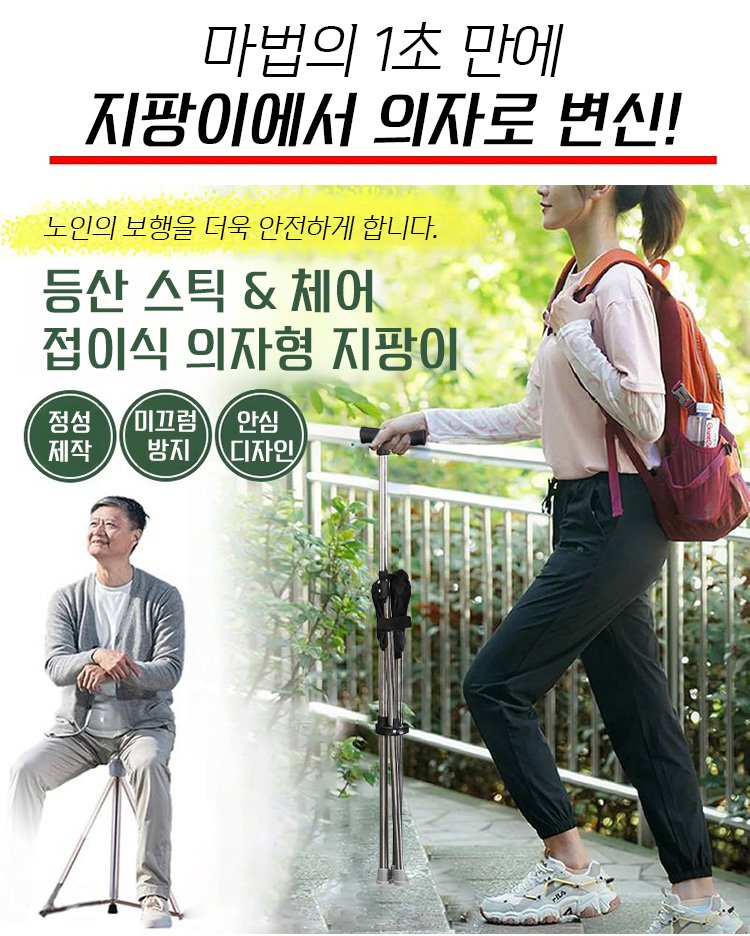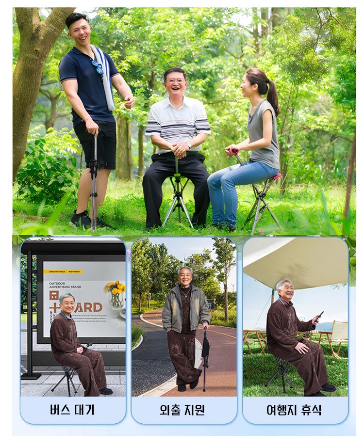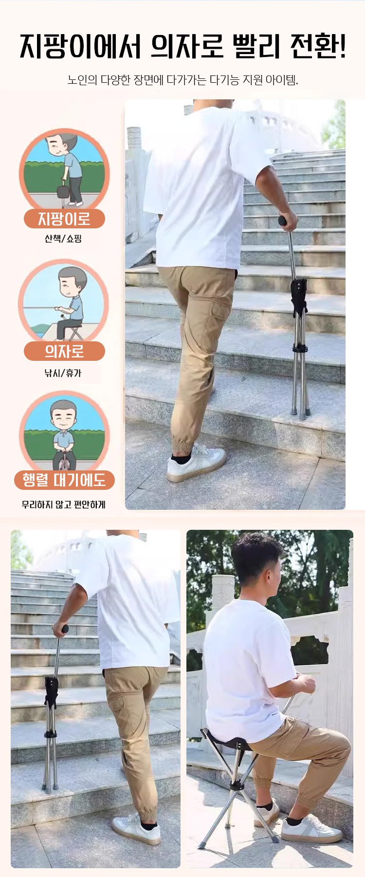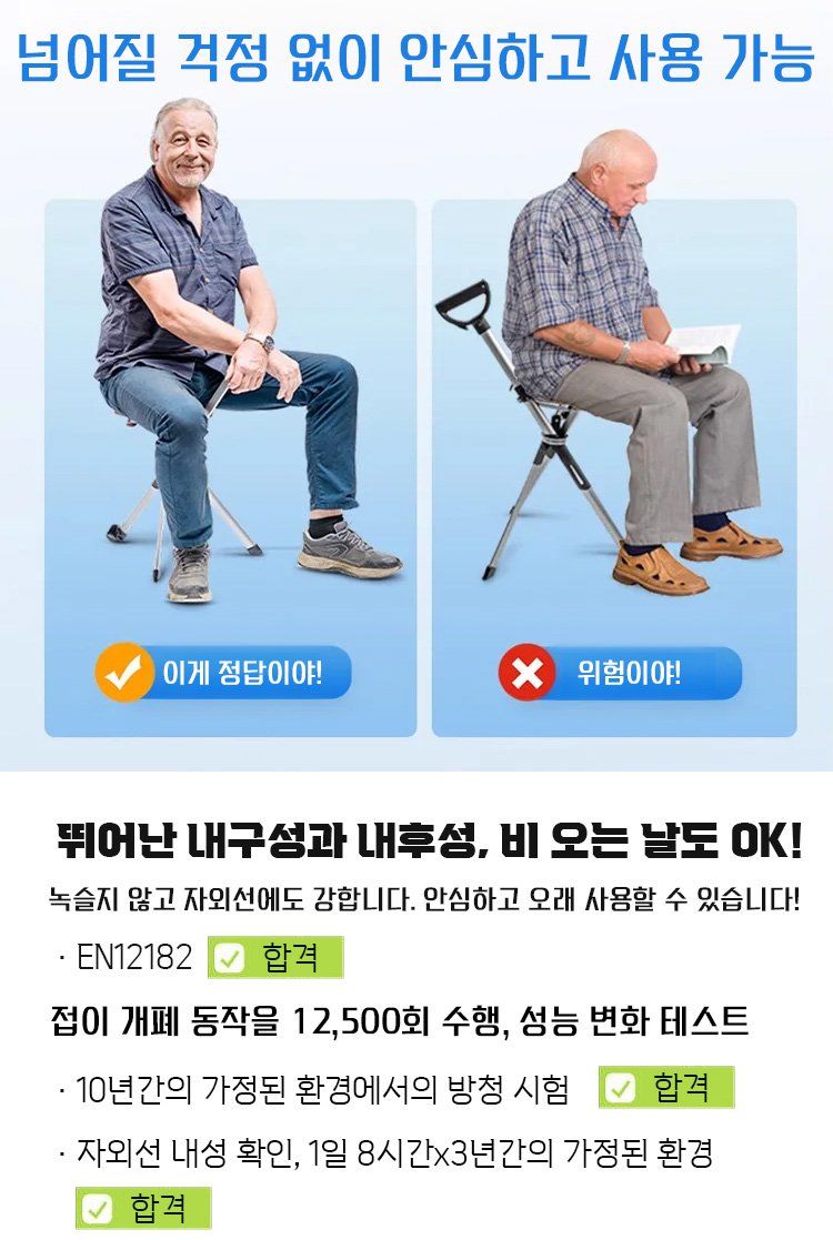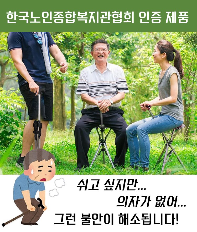 간호협회 지정 제품, 500kg 하중 견딤1초 만에 의자와 지팡이로 전환, 언제 어디서나 휴식 가능, 50년간 고장 없음, 안전 좌석보다 더 안정적임