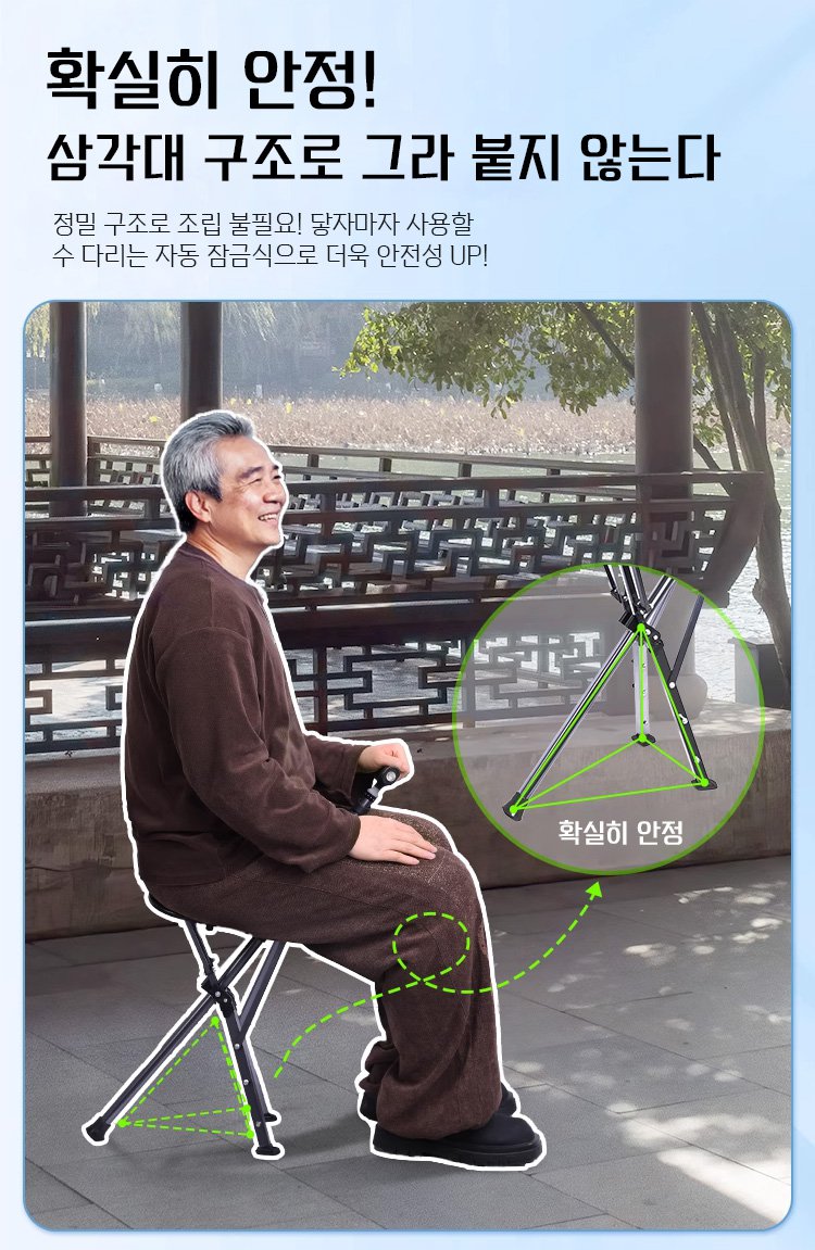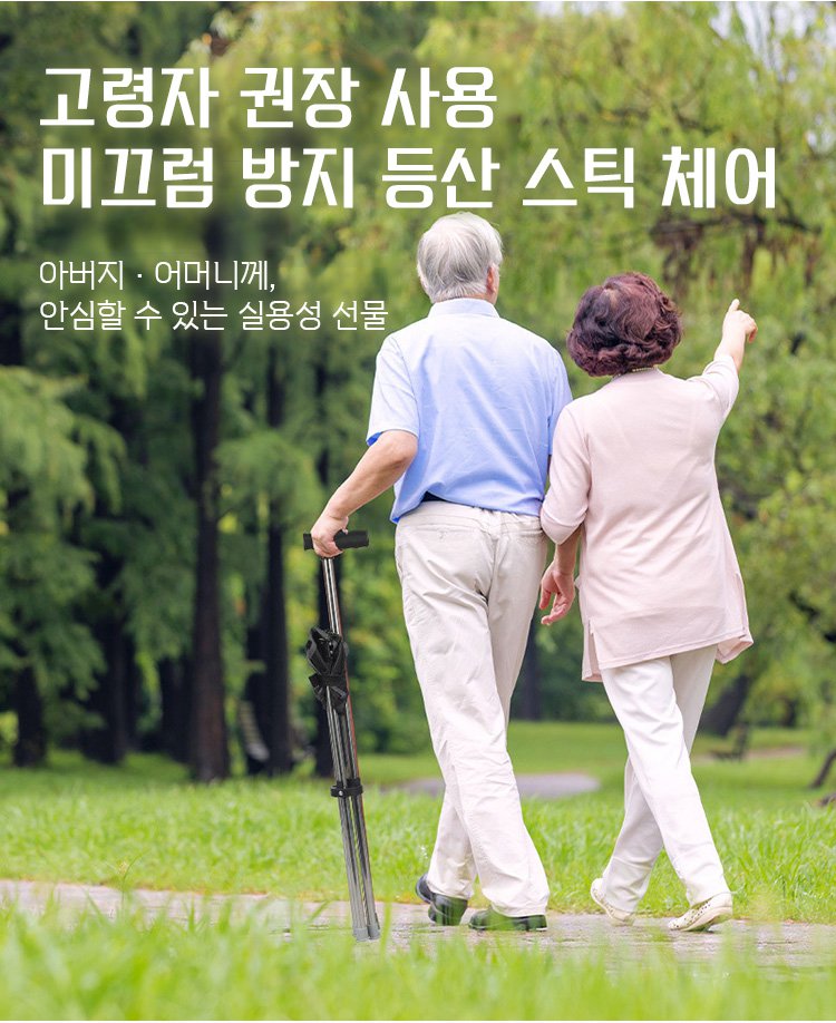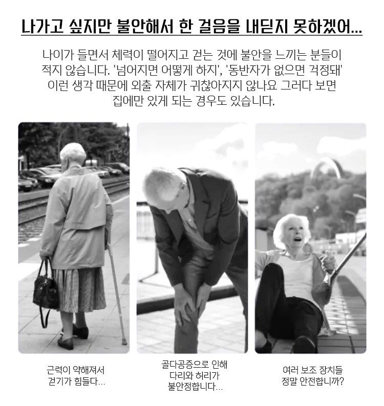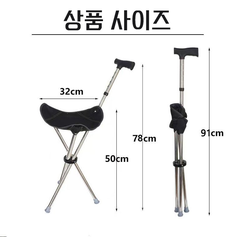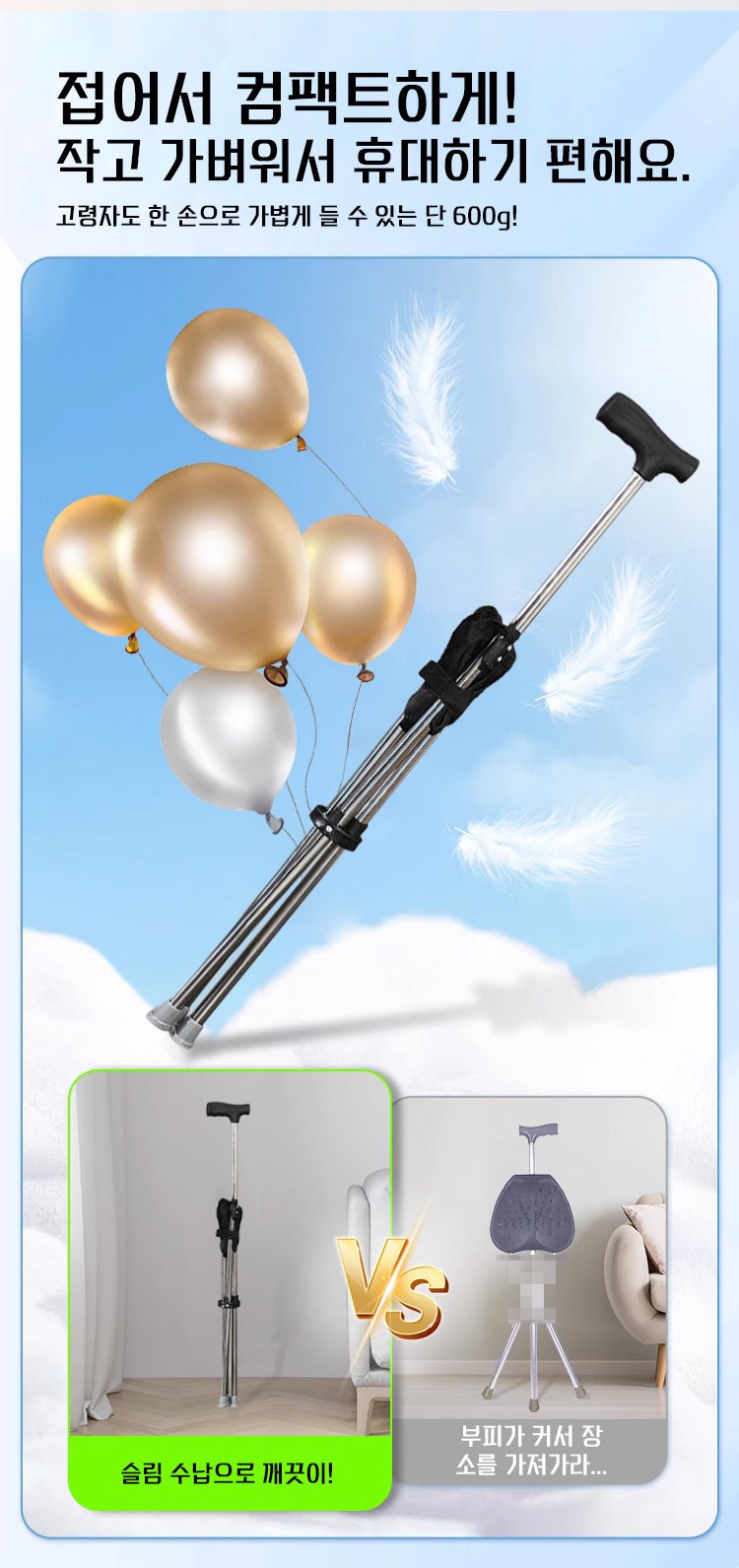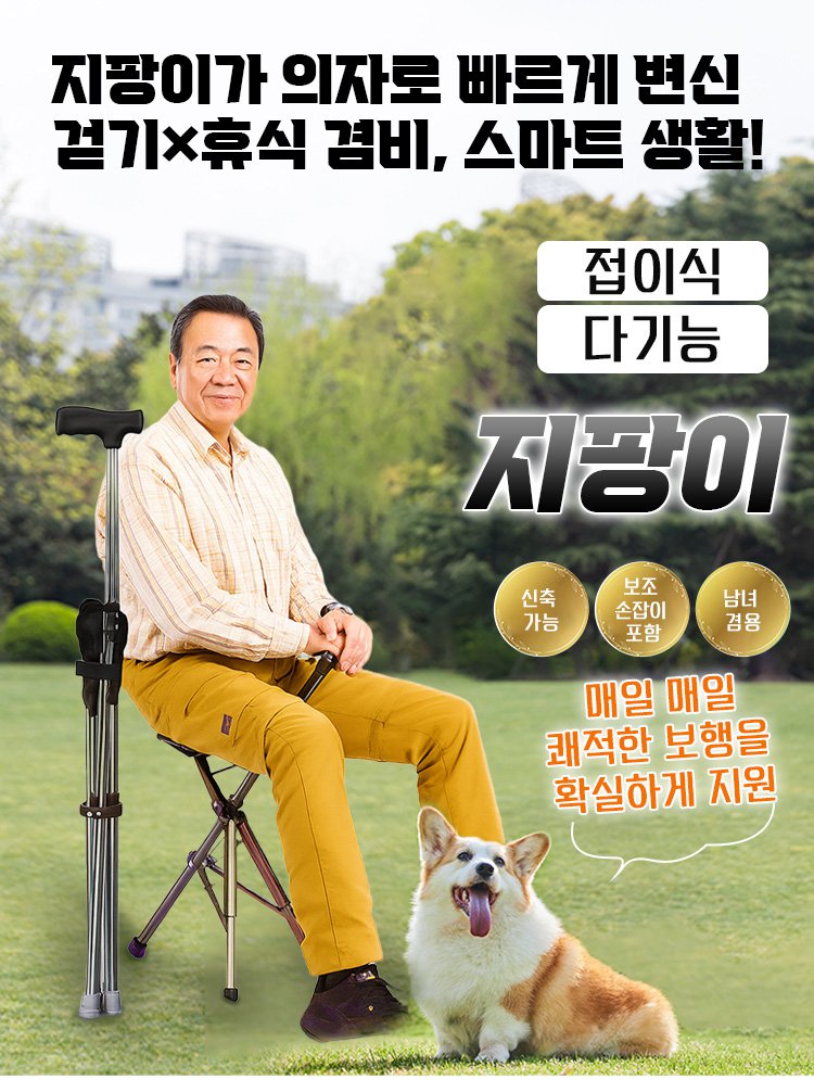 간호협회 지정 제품, 500kg 하중 견딤1초 만에 의자와 지팡이로 전환, 언제 어디서나 휴식 가능, 50년간 고장 없음, 안전 좌석보다 더 안정적임