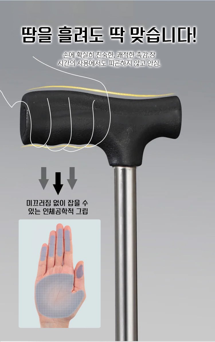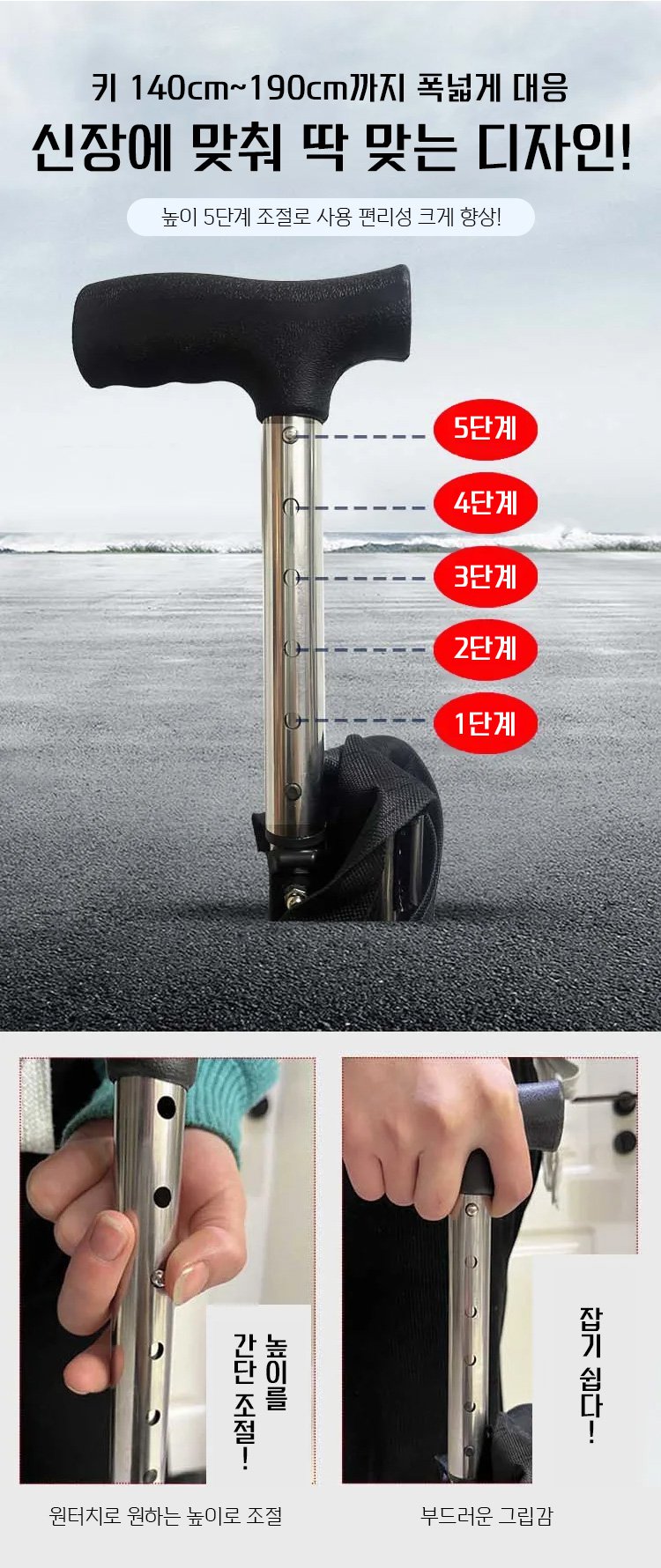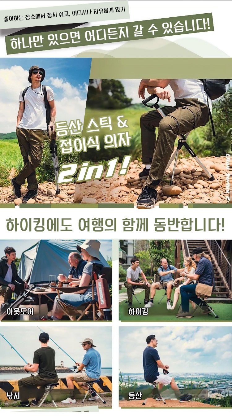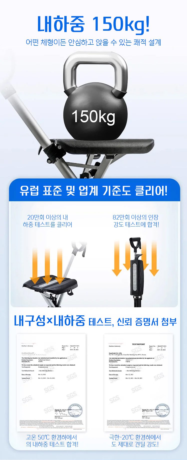 간호협회 지정 제품, 500kg 하중 견딤1초 만에 의자와 지팡이로 전환, 언제 어디서나 휴식 가능, 50년간 고장 없음, 안전 좌석보다 더 안정적임